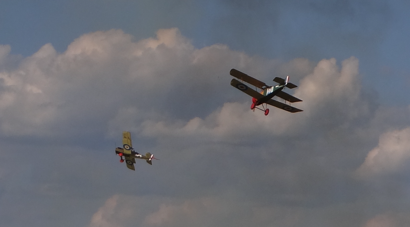The Pterodactyl Flight show is a real spectacle, with a script. The Pterodactyl Flight group has tents of two enemy bases, English and German, in the take-off field. All participants of the show are dressed in period costumes. They have cars, cannon and period equipment at their disposal. The show begins with the take-off of German aircraft that bomb English positions. There are pyrotechnic effects: explosions, fires and a lot of smoke. An English car is on fire. Then follows the take-off of English aircraft. There are air duels between enemy planes. Series of machine guns are heard. One of the German aircraft is shot down. Emergency landing. Failed emergency landing simulates an airplane on the ground that is set on fire. A team of soldiers rushes to the rescue and drives a car. Unfortunately, the flyer dies. The fallen airman even has his grave.