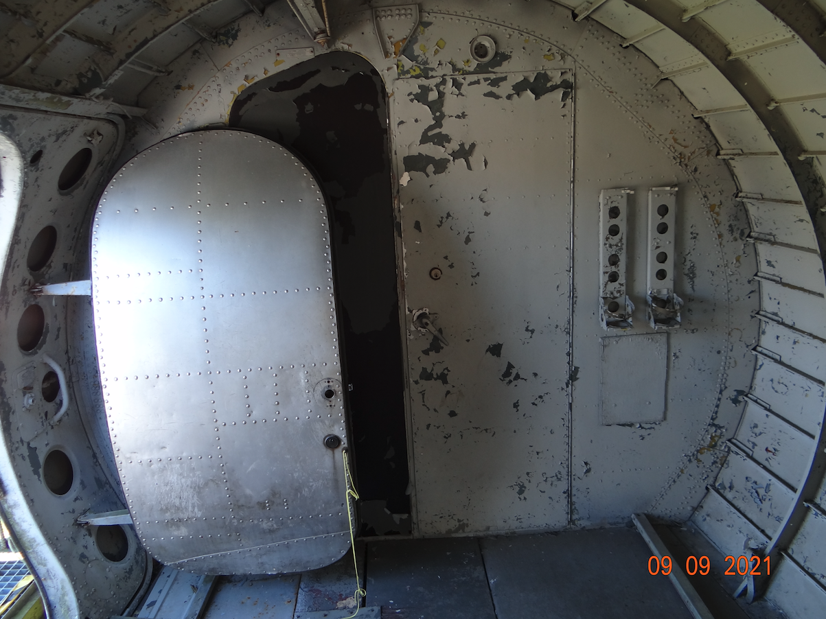 Opis zdjęcia: Samolot ma drzwi w drzwiach. Otwarte są drzwi mniejsze dla desantu, które mogą być otwarte w trakcie lotu. Drzwi te otwierają się do wnętrza ładowni. Większe drzwi są niemal kwadratowe, mają zawiasy na górze i podnoszone są do góry. Ich otwarcie możliwe jest tylko na ziemi. Ponieważ kadłub samolotu nie jest ciśnieniowy, dlatego drzwi nie wymagają specjalnych zamków i zawiasów.