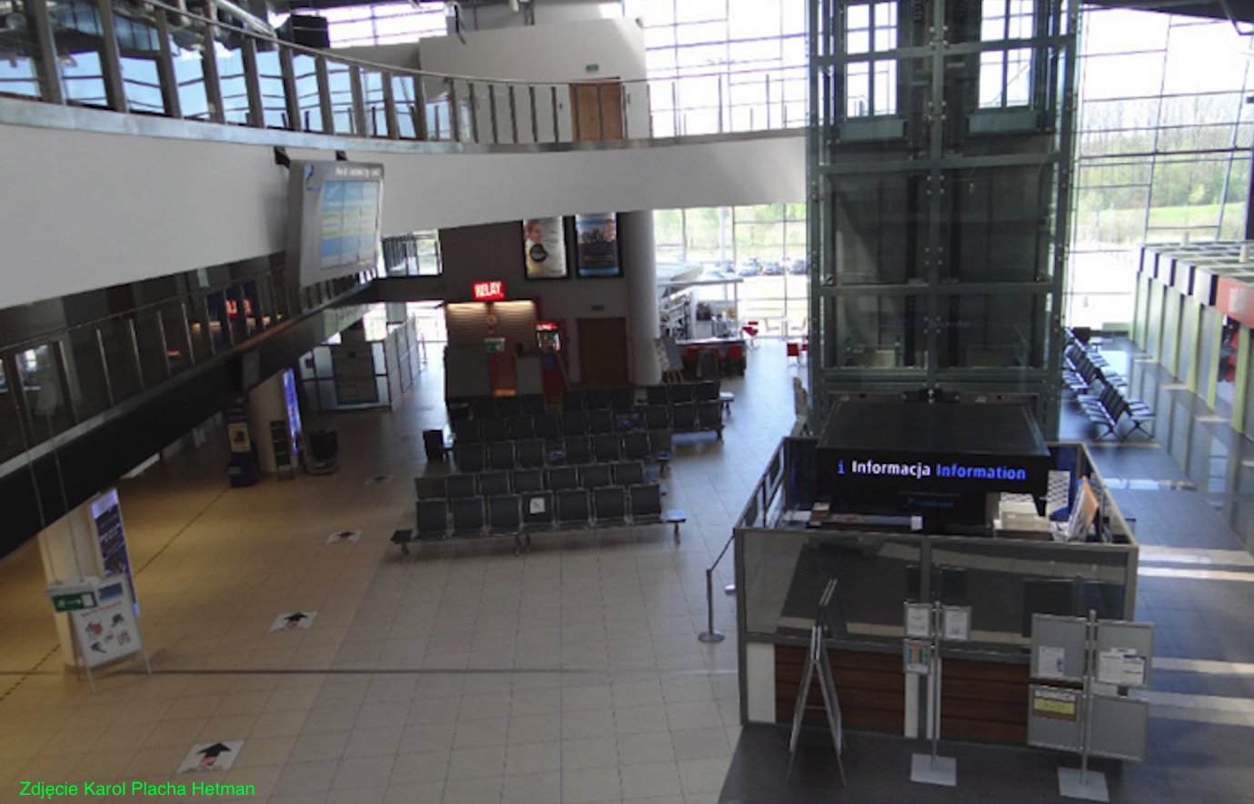 Opis zdjęcia: Widok z tarasu na płaszczyznę peronowa. W remontowanej części stał poprzedni terminal. W oddali widać zakłady WZL Nr 1 SA.
