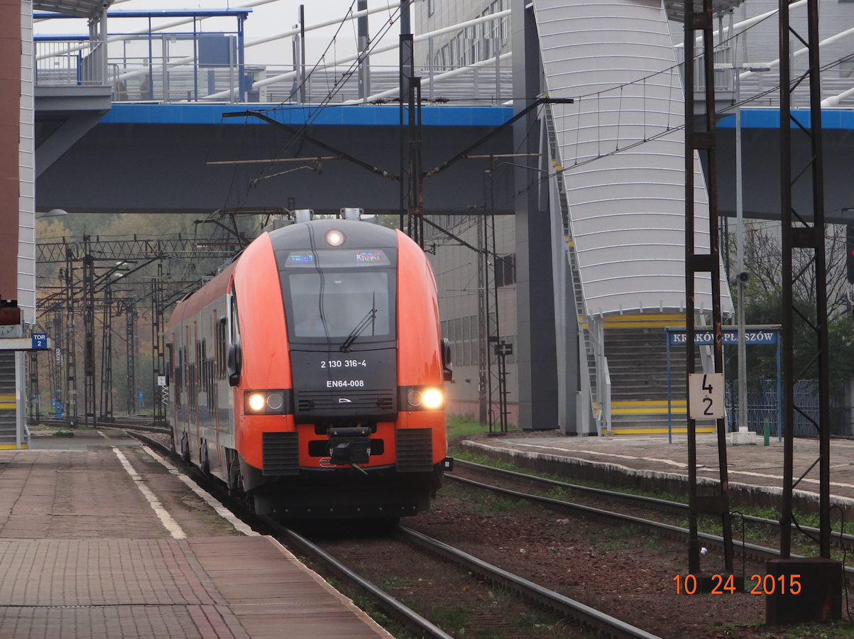 Opis zdjęcia: Skład EZT EN-64-008 nr 2130316-4 do stacji Kraków Lotnisko. Stacja Kraków Płaszów.