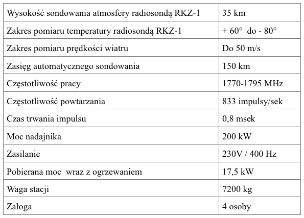 Dane techniczne stacji RWZ-1